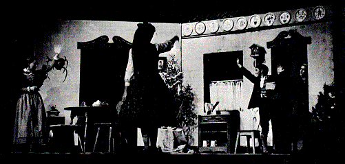 Scene Three: Following a short little interlude in the forest section as Karl and Wilhelm supposedly leave the stage coach, the scene shifts back to the right side of the stage and Gruber home again. Annalisa sings a gay waltz aria in the midst of happy preparations for Christmas and Karl's homecoming. As she leaves and Papa enters, Karl tiptoes in followed by Wilhelm. Papa is surprised to have him arrive two days early and is worried for fear that he has been sent home in disgrace. Mama is concerned that he might have been sent home with the measles! The young choirmaster is attracted to Annalisa who returns in her pretty new red dress. Karl is so excited that he gets the story about the song all mixed up and when Papa is finally enlightened by the choirmaster, he is certain that he can never find the original copy of the song because "Mama is always cleaning and throwing things away". Mama takes him and Karl to look in an old trunk for the song while Wilhelm and Annalisa express their growing interest in one another in a tender little duet. Papa cannot find the original copy of the song and is reluctant to write it down again as he cannot believe that the King could be interested in such a simple song and that "it will soon be forgotten anyway". This is too much for Karl who insists that the song will not be forgotten and that children all over the world "will sing it and love it as I do". The orchestra softly plays the familiar melody, and Karl's earnest little plea, "Listen Papa, I think I can almost hear the children singing it" is reinforced by Annalisa's singing with him triumphantly, Yes, we can hear them singing it now!" As the audience joins the cast in "Silent Night" Papa seems convinced and goes to the table, takes up quill pen and starts to write. In the meantime, lights have come up on the entire stage showing the choirboys, remainder of cast, and villagers with candles in the little center forest section. Everyone is singing except Gruber who continues to write. A cascade of stars seems to appear in the background, the cast builds the descant to the carol melody into a full climax and the curtain slowly falls.