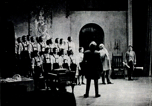 Scene Two: As the coach horn dies away and after a few bars of quick musical transition, the left side of the stage "erupts" with the lively pranks and gay singing of the choir boys in the choir rehearsal room at St. Peter's. The mischief includes a "loop" on the head of the young choirmaster, but the culprit is saved from a switching by the entrance of a page who announces the arrival of the musical ambassador from the King of Prussia. As everyone scurries to his place, the pompous Von Schmallplatz enters, and the page reads a proclamation about a "beautiful Christmas song" whose composer the King is anxious to find. After the choirboys and page are dismissed, Von Schmallplatz shows choirmaster Wilhelm a copy of the song which is none other than Gruber's "Silent Night". Wilhelm has never heard it but keeps it to teach it to his boys. As they go out, the choirboys rush in, playing "keep away" with a basket that has just arrived from home for Karl Franz. When he finally gets it and opens it, there is a Christmas pudding inside, complete with a large sprig of prickly holly. They hear the choirmaster and Schmallplatz returning and Rudi hides the pudding behind his back, as he sirs in the last row and Karl must sit right up in front. They sing for Schmallplatz and then he requests a solo. Rudi is picked to sing just after he has taken a large bite of pudding. His comical attempt to sing with the pudding in his mouth and his frantic efforts to please the fussy Schmallplatz cause him to sing very poorly and 'way off key, which infuriates Schmallplatz who throws the music to the floor and scolds Wilhelm for his inferior teaching. In the meantime, the pudding has circulated among the boys and reaches Karl who in sympathy for Wilhelm and encouraged by the other boys, puts the sprig of holly on Schmallplatz' chair. The ambassador sits but nor for long! Then ensuing confusion and hilarious attempts of the boys to prevent Schmallplatz from reporting the incident comes to a climax when poor Wilhelm finally achieves order and Karl is punished by loosing his forth-coming Christmas holidays. Left alone in disgrace, the homesick boy sings his father's "Silent Night" and is overheard by the young choirmaster who is overjoyed to discover the "lost song". The scene ends in joyous excitement as they both prepare to return immediately to the Gruber home to secure the original copy of the song to send it to the King.