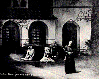 The stage is darkened for a moment to indicate the passing of six months When the lights go up, elaborate preparations are being made for the fiesta to celebrate Padre's birthday. Unfortunately, the bells have not come, and Pepito and Rosita are just ahout to give up in despair when Pepito spies a line of pack mules and horses coming up the dusty road. They hurriedly send Manuel, a Mis- sion Indian, to head them off toward the church, so he can supervise the hanging of the bells in secret while Padre and the others are kept amused by the fiesta in the patio. The fiesta follows with singing, dancing, Indian ceremonial dancing, and presents for the Padre. He thanks them all and says that only one thing is missing "our beautiful Mission bells but surely before another fiesta comes we shall have them again." At this moment Pepito signals madly to Manuel and from the church off-stage comes the joyous pealing of the new bells. Padre and the others are overcome with surprise and joy. Pepito is proclaimed the hero of the hour for his part in finding the treasure, and the curtain falls on a joyous Te Deum sung in thanksgiving for the new bells.